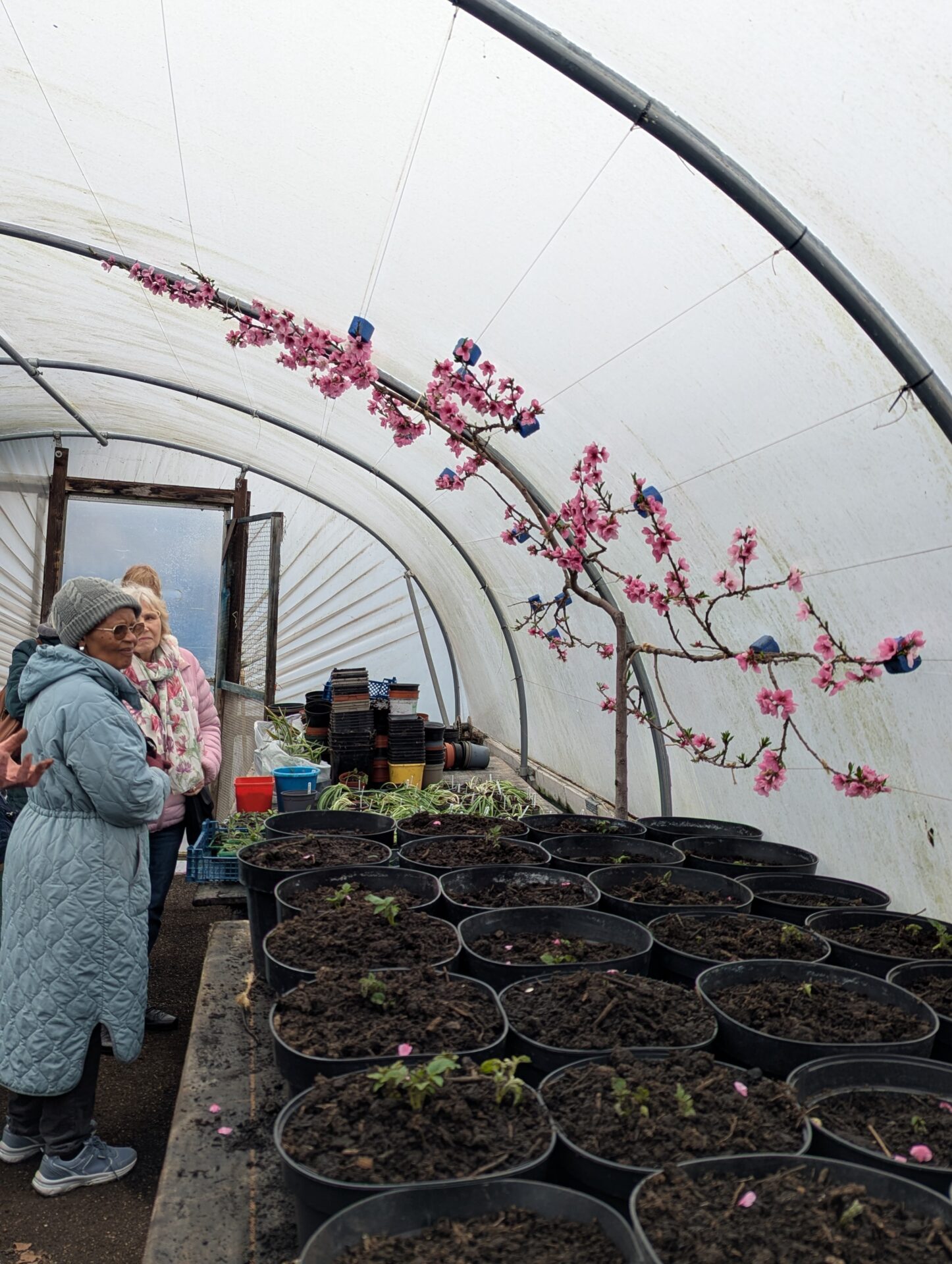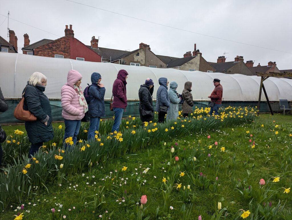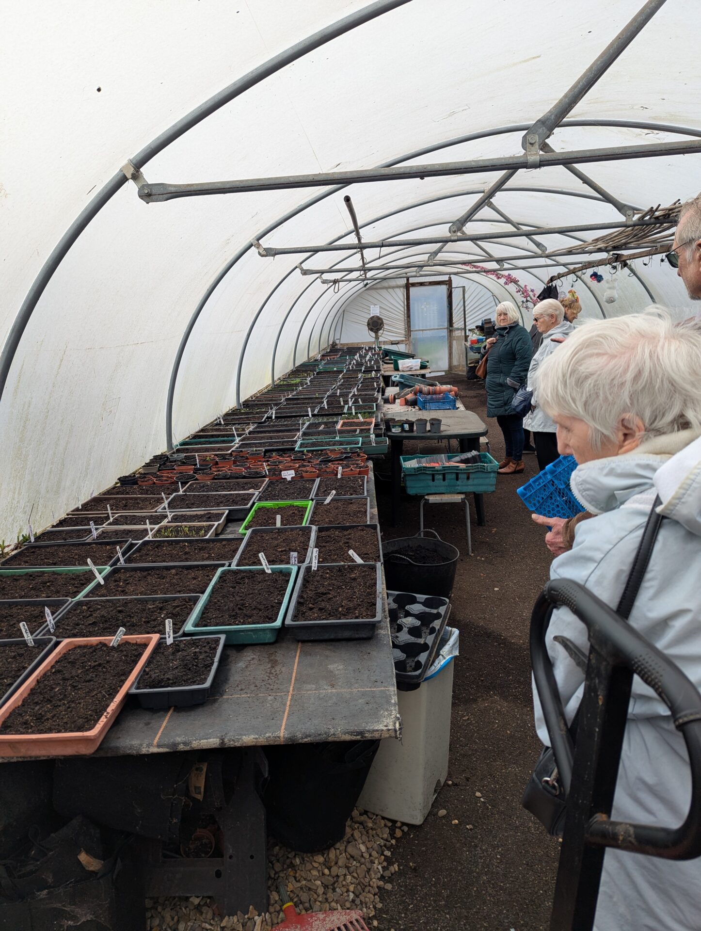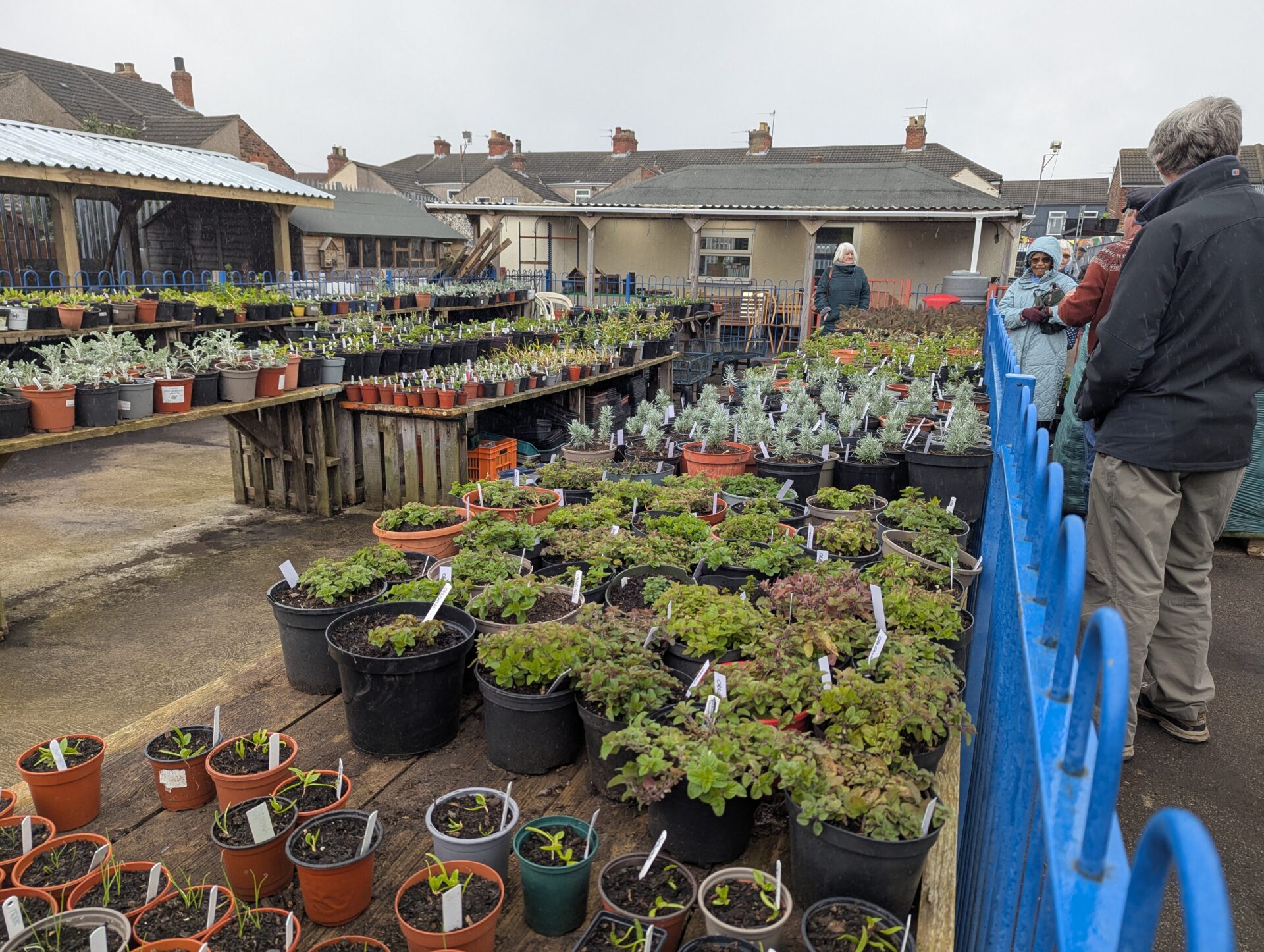 It was a cold damp visit to "Your Place", a community centre and garden in Grimsby's East Marsh. However being gardeners we were well wrapped up and we enjoyed Ernie's chat about the gardens and the biggest whale bones in England which are being made into an arch.. Almost everything is procured by donations, the flower pots, the planting medium the seeds, and the the plants. Local volunteers sow in pots and trays in a conveyor belt system. This results in 1000s (yes really) of plants for sale at minimal price (20p for small pots and £1 for big pots containing 5 sizable plants). Everything sold is pure profit. The aim is not to make money but to provide an interest for the local underprivileged community. 14 of us spent over an hour being entertained by Ernie and a few stayed on for his sourdough demo.